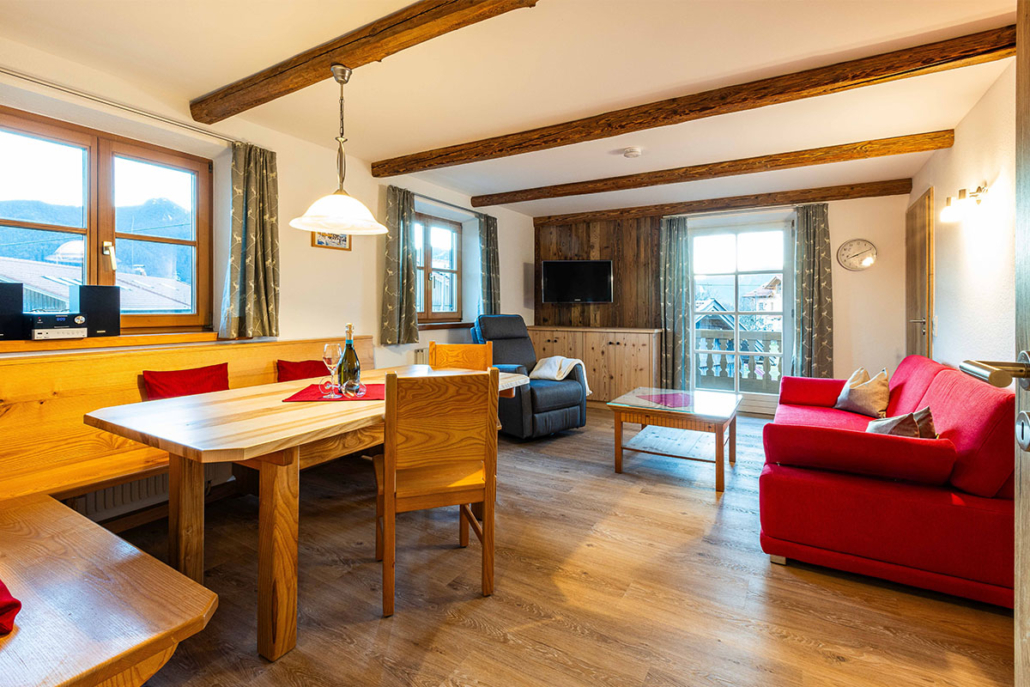 Unsere Ferienwohnung Lenggriesblick liegt im ersten Obergeschoss und bietet einen fürstlichen Ausblick auf Lenggries.